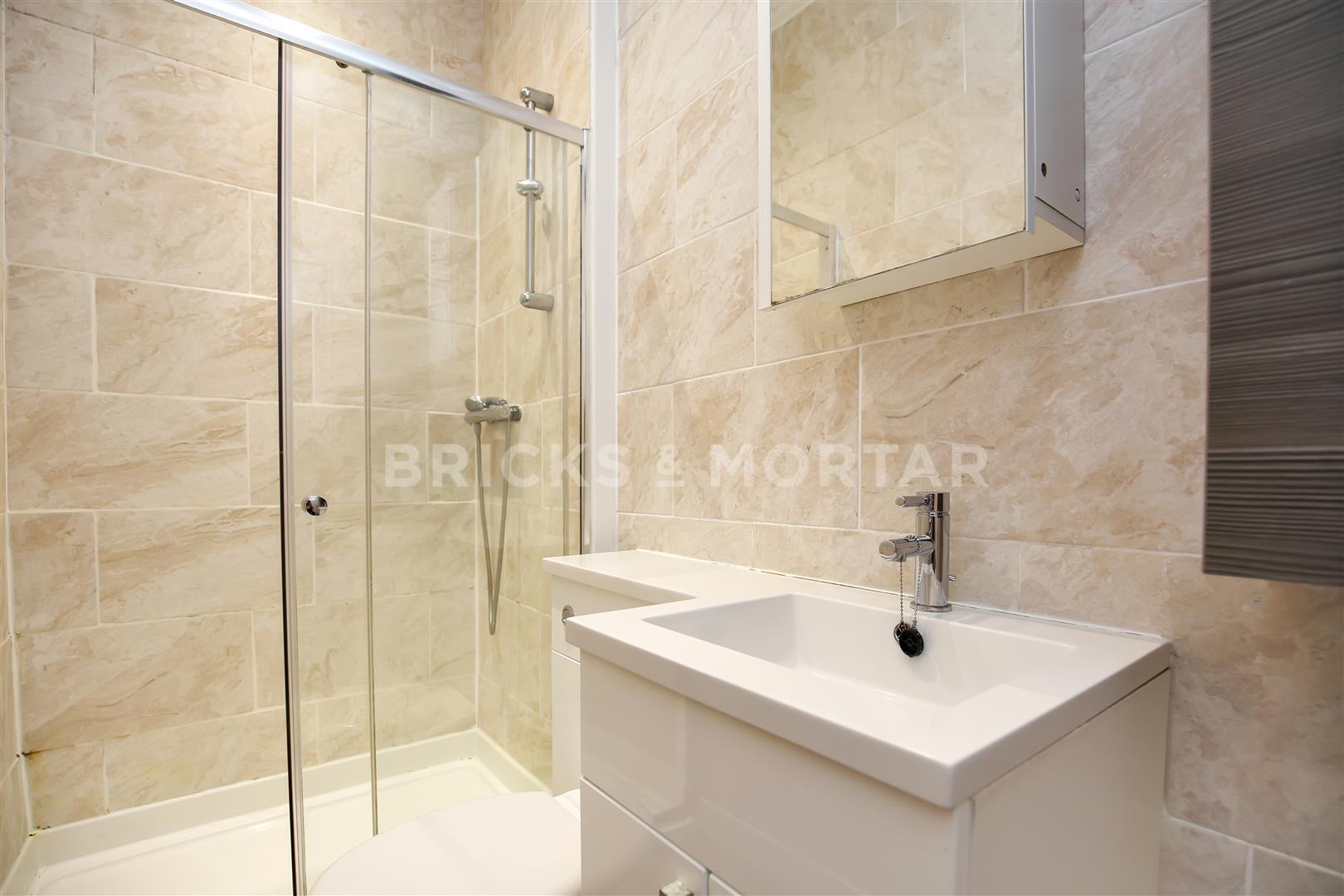 The stylish bathroom briefly comprises of a double shower with WC/basin unit with a chrome mixer tap.