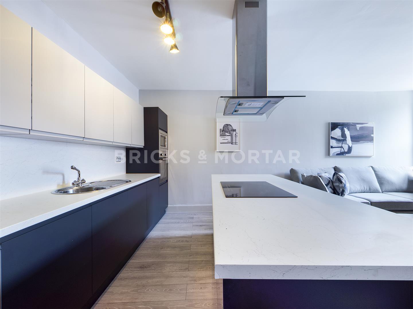 The apartment includes a delightfully modern open plan kitchen and living space which opens onto a balcony. With a beautiful, fully integrated two tone kitchen which includes an island, extractor hood and electric hob, two built-in fridges, double oven, blue and grey units with white marble effect worktops.