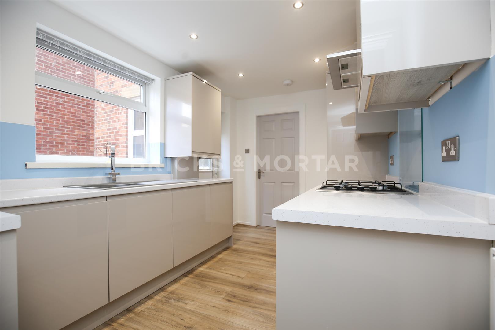 The living space is light, bright and accommodates two beautiful sofas, huge wall mounted TV with feature chimney breast wall, complimenting industrial and wooden display unit and coffee table along with a glass dining table and chairs. The kitchen is fully integrated with sleek, stone coloured units, quirky blue splashback and integral appliances with access to a private rear yard.