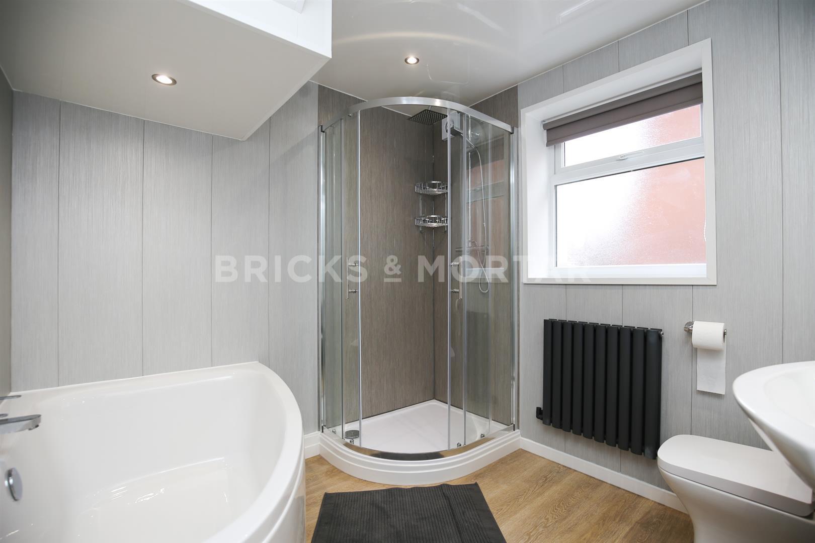 Both bedrooms are good sized doubles, including feature blue wall, double bed, desk, chair, drawers and wardrobe. Additionally, the bathroom to the rear is larger than average for a flat of this location with a separate corner bath, large corner shower cubicle, designer grey radiator, WC and sink with vanity unit and large wall mounted mirror.
