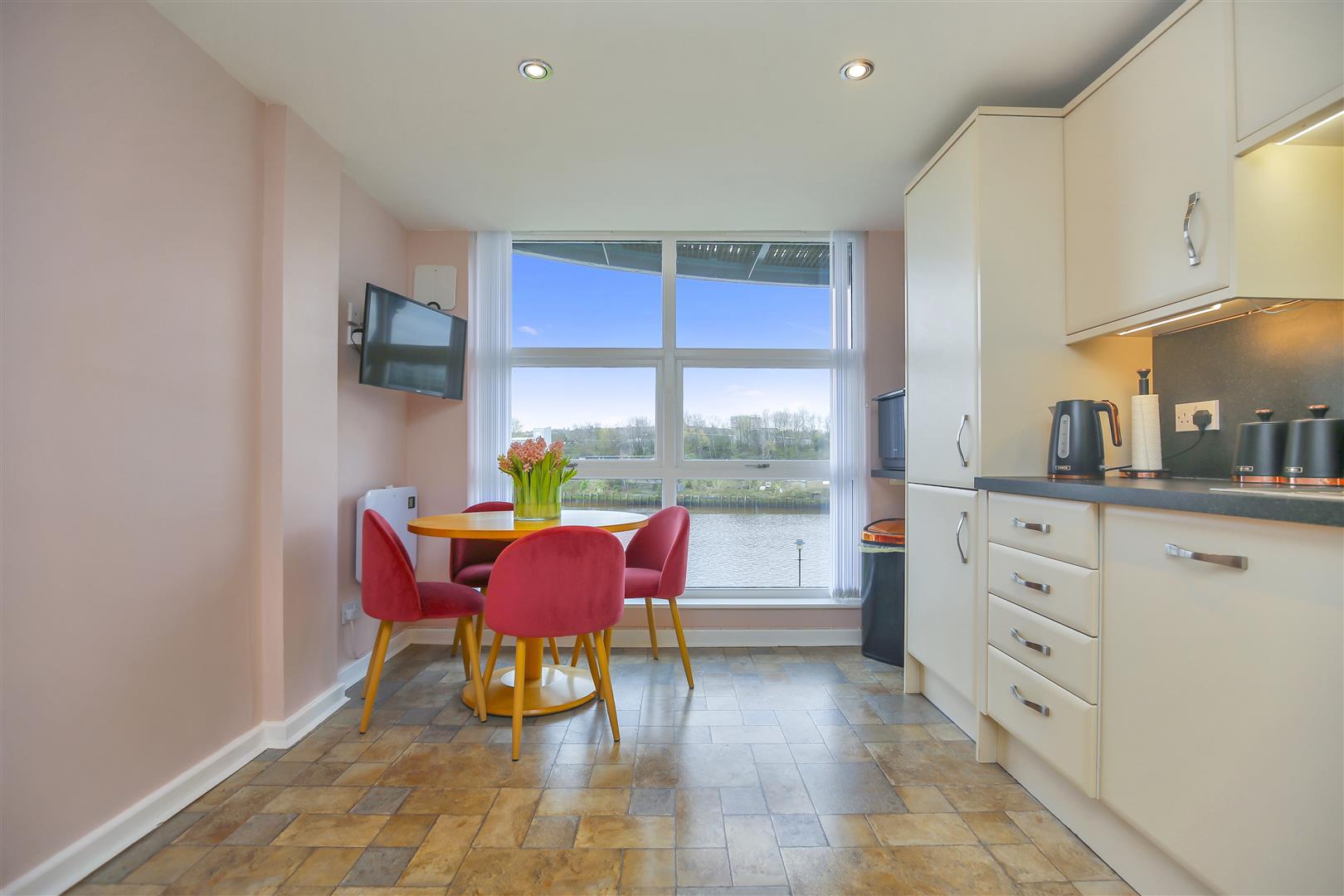 There are three bedrooms, the master with a beautiful large bathtub and double glazed French doors leading to a balcony overlooking The River Tyne, complete with a TV.