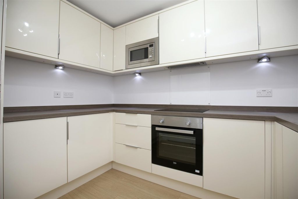The kitchen includes cream gloss units with integrated appliances and the living room features patio doors onto a Juliet balcony.