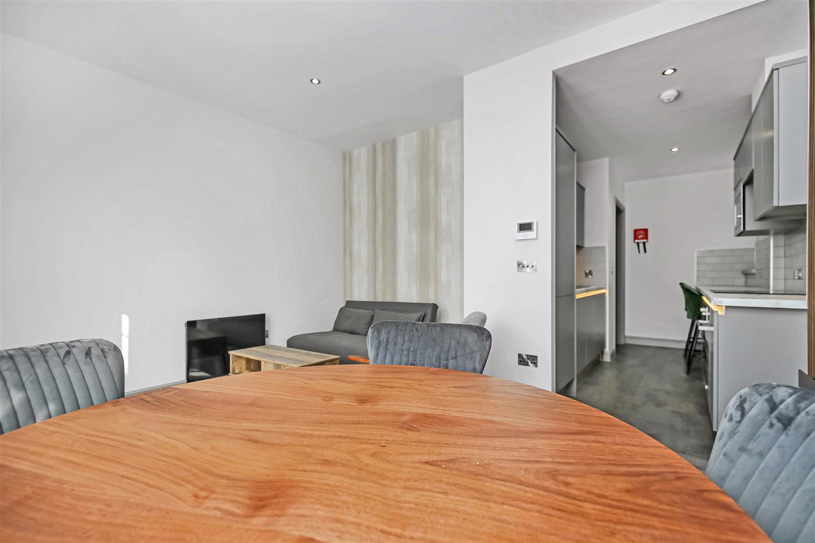To the living space is a comfortable sofa, a stylish coffee table, and a flat-screen TV with vertical panelling for a contemporary touch. The integrated kitchen unit is well-lit and features a breakfast bar with stools, perfect for casual dining.